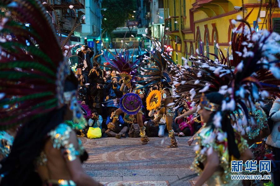 12月6日,人们在澳门参加拉丁幻彩大巡游。当日,为庆祝澳门回归祖国16周年及历史城区申遗成功10周年,由特区政府文化局主办大型嘉年华活动——澳门拉丁城区幻彩大巡游上演。海内外千余演员为居民游客带来一场融汇东西方文化的狂欢派对。新华社记者 张金加 摄