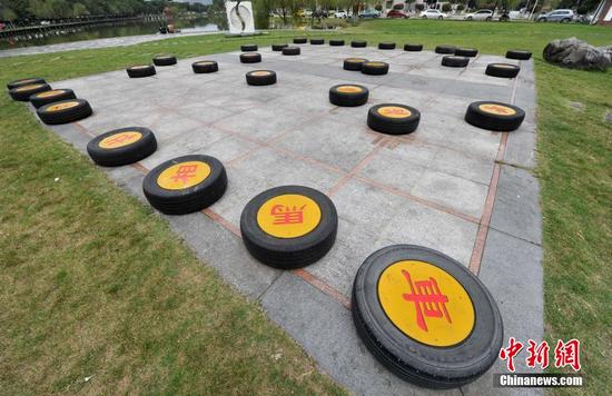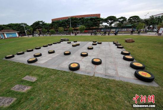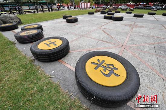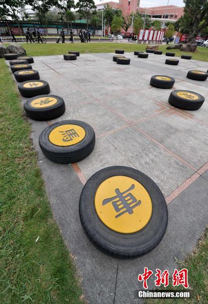 12月4日,位于福州的福建中医药大学校园内有一个“操场棋盘”,棋子用废旧汽车轮胎制作。个性十足的“巨型象棋”成为校园一景。(张斌 摄)