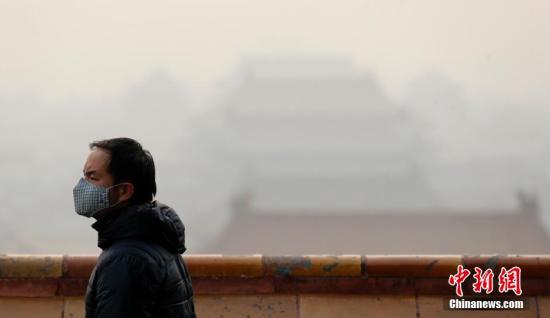 12月7日,一名戴口罩的游客在北京景山游览。当日,北京市应急办于当日18时发布空气重污染预警等级由橙色提升为红色的消息,即全市于12月8日7时至12月10日12时将启动空气重污染红色预警措施。这也是北京市首次启动空气重污染红色预警。 中新社记者 盛佳鹏 摄