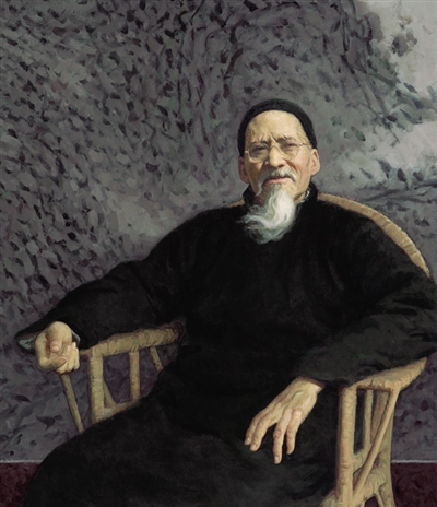 此后在另两张以黄宾虹为人物的画作中,靳尚谊更是尝试以油画方法来表现中国水墨画的质感。在《髡残》中则完全以油画来表现中国的山水景观。
