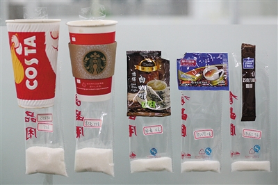 用白砂糖呈现各品牌咖啡的含糖量;测算500ml(大杯)速溶咖啡中的含糖量是否超标。