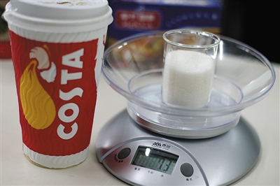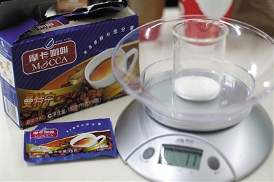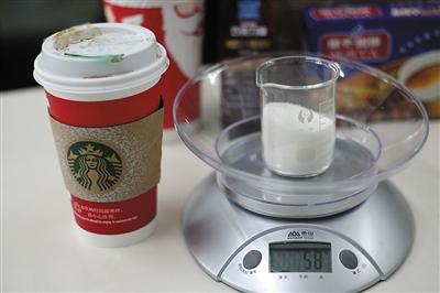 为此,新京报记者决定参照相关含糖量数据,称取白砂糖的用量,直观呈现咖啡里的含糖量,并测算500ml(大杯)速溶咖啡中的含糖量是否超标。