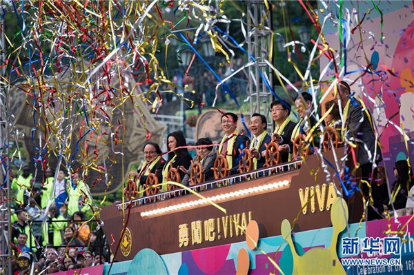 12月6日,嘉宾主持澳门拉丁幻彩大巡游开幕仪式。当日,为庆祝澳门回归祖国16周年及历史城区申遗成功10周年,由特区政府文化局主办大型嘉年华活动——澳门拉丁城区幻彩大巡游上演。海内外千余演员为居民游客带来一场融汇东西方文化的狂欢派对。新华社记者 张金加 摄