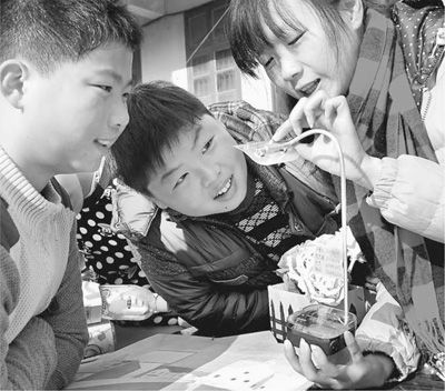 江苏科技大学志愿者来到镇江市七里甸街道四摆渡社区,向小朋友介绍用废旧材料制作台灯的方法。石玉成摄