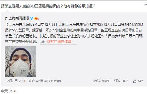 中新网12月9日电 今早,彭于晏在微博转发了一则关于海关查获假口罩的新闻,而该微博配图中戴口罩的人正是彭于晏??吹礁眯挛偶芭渫己?,彭于晏留言称,“请问这个男人带的口罩是真的假的?他有点急的想知道?!?/p>