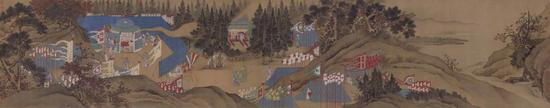 《阿房宫图》卷:据李日华《味水轩日记》卷七记载:赵千里原本并宋曾纡书杜牧赋,项元汴收得时图逸去,乃请仇英补之,纤丽之极。