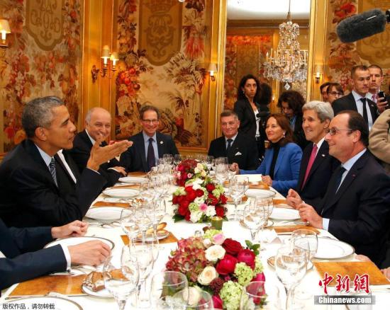 当地时间11月30日,法国巴黎,出席巴黎气候大会的美国总统奥巴马与法国总统奥朗德一同出席晚宴,陪同出席的还有美国国务卿克里等重要政府人员。
