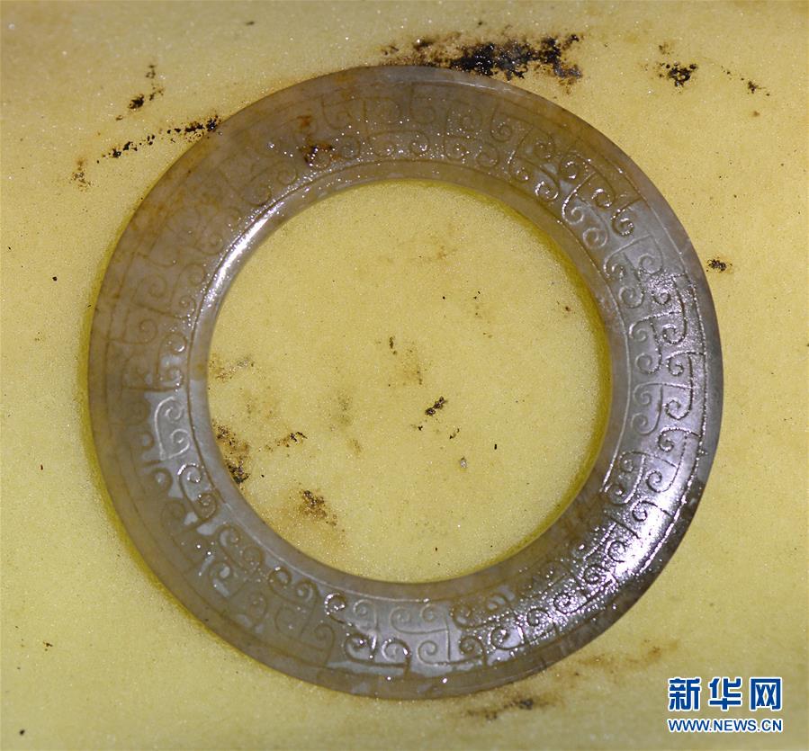 这是海昏侯墓遗址出土的玉环(12月7日摄)。 12月7日,考古工作者在南昌西汉?;韬钅怪鏖な叶喜喾⑾侄嗉衿?,其中包括玉耳杯、鸡心形玉佩、玉环等。据专家介绍,此次出土的玉器做工精美,表明了墓主人身份和地位的高贵。新华社记者 万象 摄