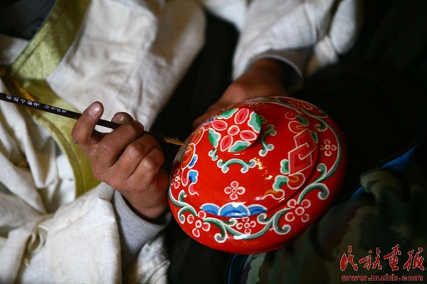 廖文华告诉我们,成品木碗从开始到制作完成需要晾干、做毛坯、水煮、修整成型、上漆、绘图等十二道工序,木碗一般选用桐树、桑树、桦树的树干、树节、树疙瘩等材料经过刮制或车削而成。这些木材做成的木碗质地坚硬,碗面光滑,纹路清晰,可以长时间不变形、不破裂。木碗的品种繁多,有藏桌、糌粑盒、辣子盒、酥油茶杯、木碗等。近年来旅游业发展了,因而又根据游客的需要新研制了鼻烟壶、手镯、茶碗、茶叶盒等旅游工艺品。