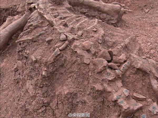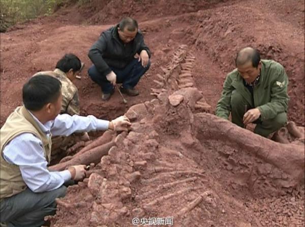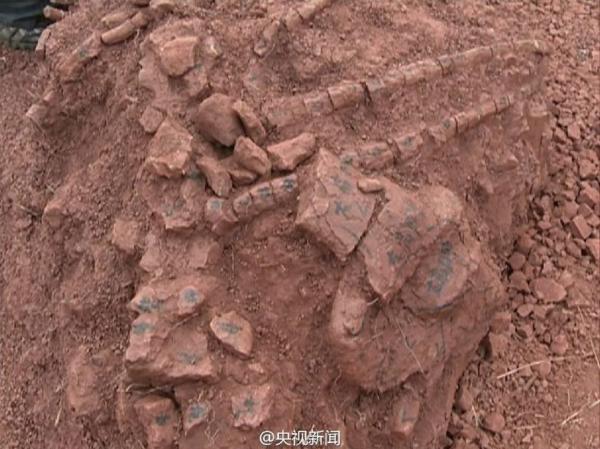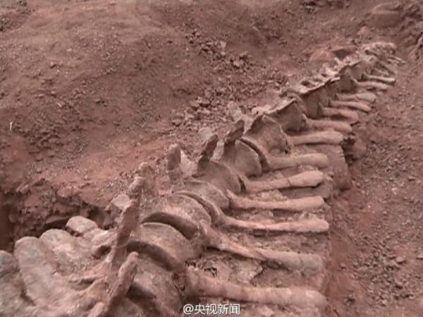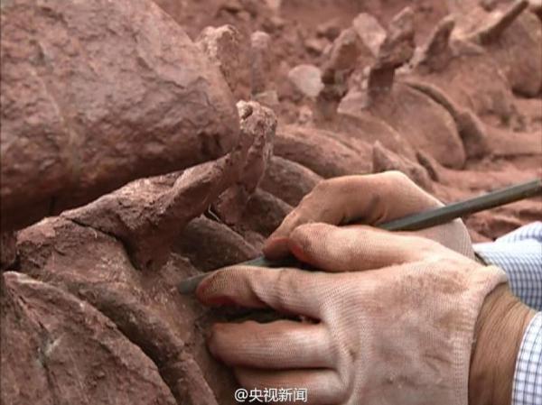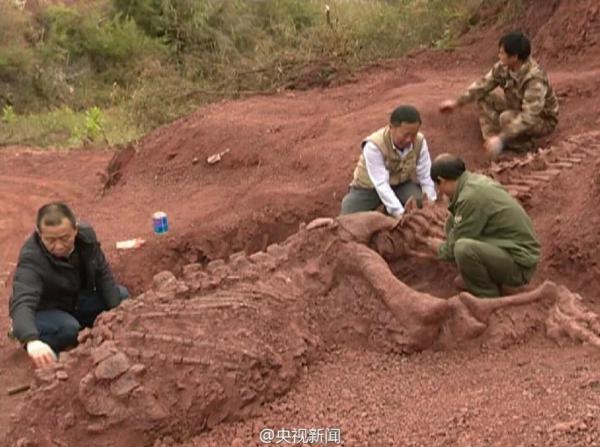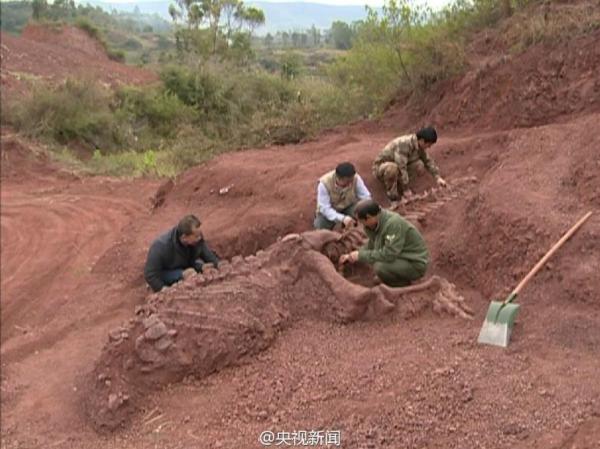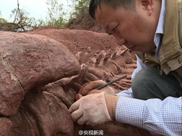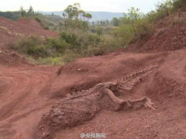 近日,云南禄丰发现两具距今约1.8亿年的恐龙化石。经鉴定,它们分别为“巨型禄丰龙”和“许氏禄丰龙”,是侏罗纪早期最早出现的恐龙之一?!熬扌吐环崃被4娼贤暾糠?.3米,据推测完整长度近9米,保存部分为背椎、荐椎等多部分。 央视记者 赵鹏 摄