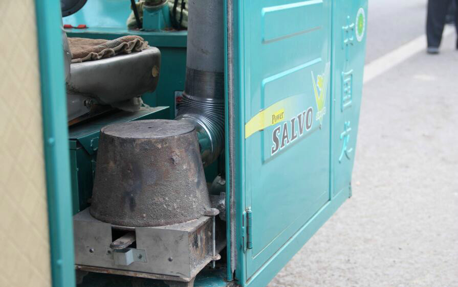 2015年12月10日,山东滨州,一辆经过改装的三轮车停在街头。日前,山东滨州一名毕姓车主将自己的电动三轮车进行了一番改装,装上烟筒生炉子取暖。这辆三轮车不仅可以生炉子取暖,还能给手机充电、看电视,大爷如此深度的改装让网友大呼“高手在民间”,“完爆”车载空调,每天都会吸引很多车友围观一番。
