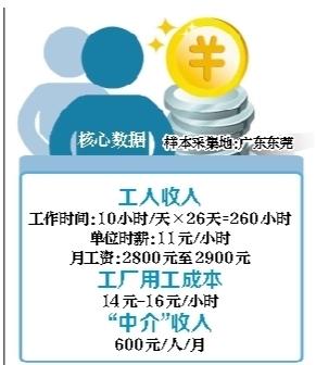 工厂付出的14至16元/小时的用工成本实际是从劳务中介拿人的成本,劳务中介则按照13.5元/小时与“工头”结算,大约从中赚走1.5至2.5元/小时?!肮ね贰痹蚋と丝?1元/小时的价格,从中赚走2.5元/小时。