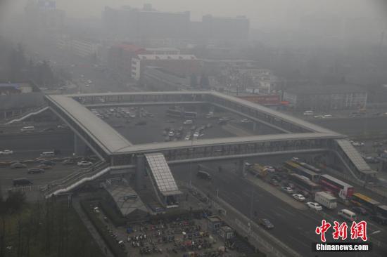 12月8日,北京中关村人行天桥笼罩在雾霾里,桥下的车流量比平日减少。北京市应急办7日晚间发布空气重污染红色预警,全市于12月8日7时至12月10日12时启动预警措施,施行车辆单双号限行。 中新社记者 张浩 摄