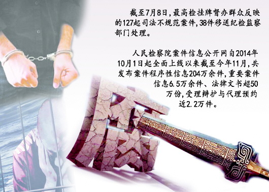各地检察机关动真格、敢碰硬,挂牌督办反映出的重点问题,涉嫌违纪违法的,坚决查处。截至7月8日,最高检挂牌督办群众反映的127起司法不规范案件,38件移送纪检监察部门处理。