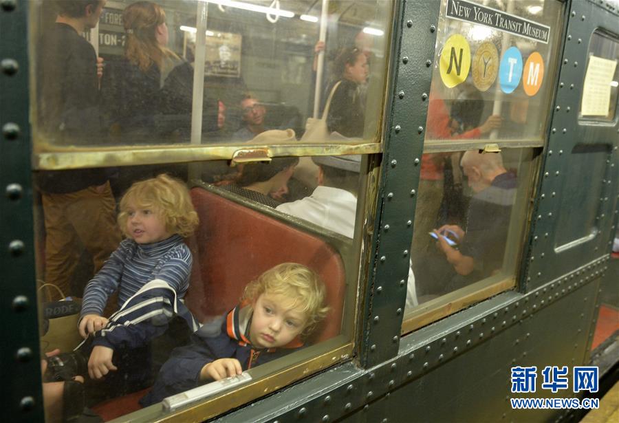 12月13日,两名儿童在纽约曼哈顿第二大街地铁站乘坐半个世纪以前的地铁车厢。