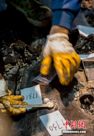 记者看到,考古人员小心翼翼地对一些长约1米的片状器物进行提取。据现场专家介绍,这些文物应该是属于漆器,可能是竹藤,或者是柳藤,下面用铜墩套住,这应该属于仪仗性质的器物?!耙钦唐魇褂迷诘笔币裱恍┕婢?,而如果我们研究出了这些规矩,对墓主身份判断是有帮助的。”