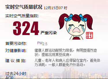 【新民网讯】在西北风推送下,大量空气污染物昨天侵袭上海。14时后,申城开启重度污染模式。上海中心气象台于16时10分发布霾黄色预警信号。根据上海市空气质量实时发布系统数据,目前AQI指数为324,空气质量已达重度到严重污染。预计今天中午以前霾仍将维持,下午起霾天气逐渐减弱。建议早锻炼人群和呼吸道疾病患者尽量减少外出,外出时做好防护。