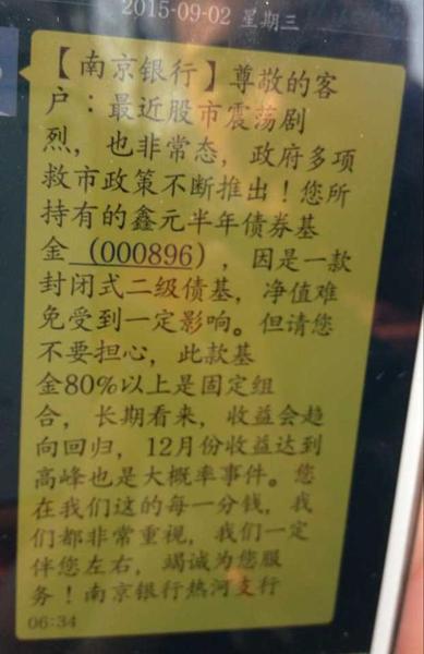 9月,王阿姨收到来自南京银行的短信,内容称:“由于受到股市震荡,鑫元半年债券基金受到影响,但是长期来看,收益将会回归,12月份收益达到高峰也是大概率事件?!?/p>