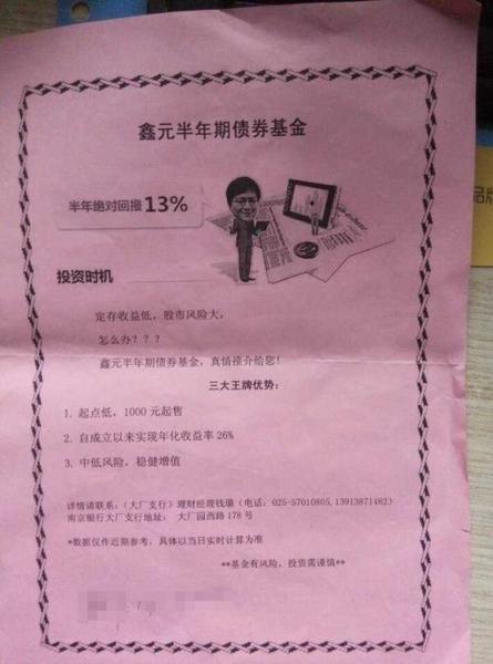 与此同时,澎湃新闻从一份关于鑫元基金的宣传单页复印件中看到,“半年绝对回报13%”、“中低风险,稳健增值”等字样,其中还写明理财经理的电话和地址。