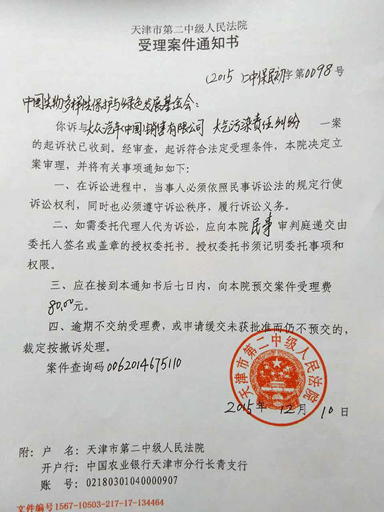 12月14日,澎湃新闻从中国生物多样性?;び肼躺⒄够鸹幔ㄏ鲁浦泄谭⒒幔┗裣ぃ渌叽笾谄担ㄖ泄┫塾邢薰酒滴财欧懦昊肪彻嫠咚?,已经在天津市第二中级人民法院立案。