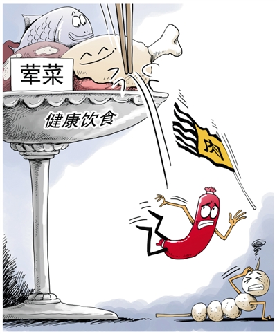 13日,广东省教育厅透露,广东发布《关于进一步加强学校食品安全促进膳食营养均衡工作的通知》,引导学校食堂合理安排膳食,烤串、火腿肠等腌制食品将不算荤菜,学校将逐步不销售对健康不宜的碳酸饮料、方便面等。(12月14日《京华时报》)漫画/张建辉