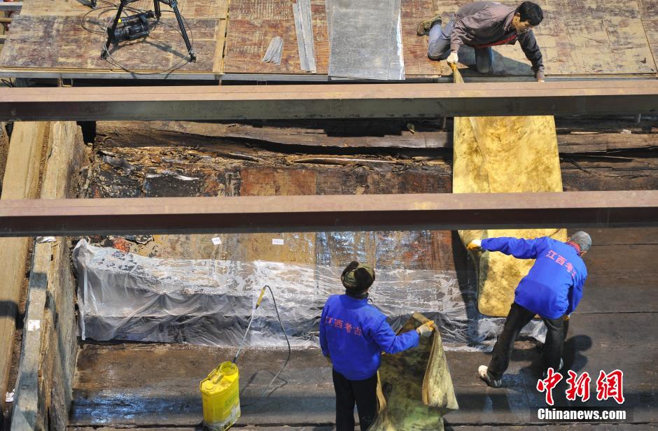 备受关注的南昌西汉大墓15日进入主棺清理发掘阶段。中新网记者从考古现场获悉,为?;ず梦奈?,考古专家组决定把主棺棺柩整体“打包”至附近考古实验室,整体打包重量达10吨以上。