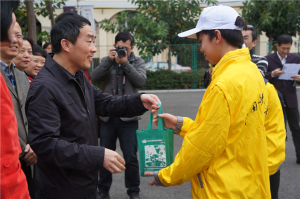 12月8日,由福建省侨办、致公党福建省委、致公党厦门市委主办的2015年海外华裔青少年“中国寻根之旅”冬令营在厦门举行。来自印尼雅加达南洋学校的23位老师和学生参加了本次冬令营。图为开营仪式上营员们获赠《指尖上的中国》系列丛书。