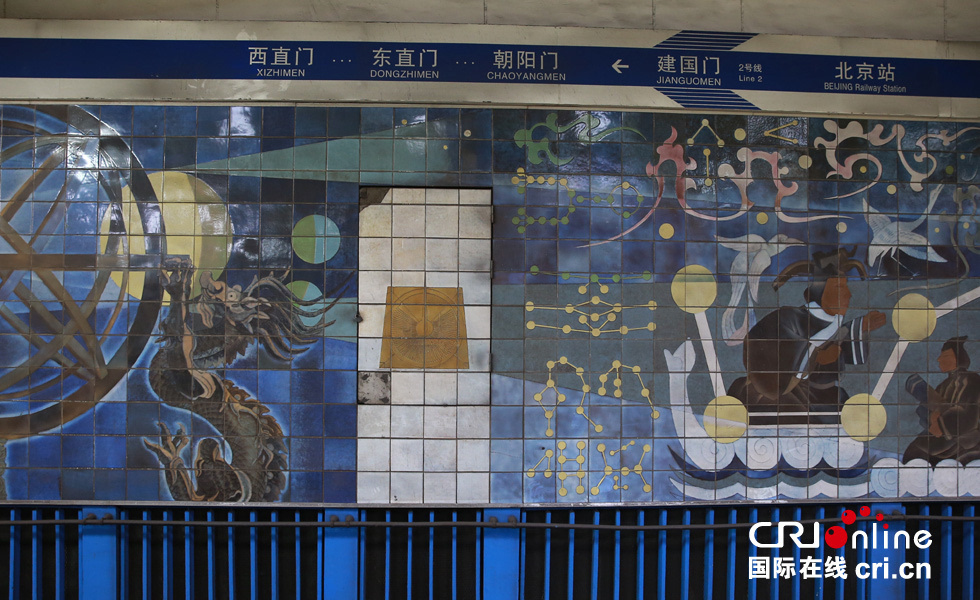 《中国天文史》和《四大发明》是建国门地铁站内的两幅壁画?!吨泄煳氖贰返纳杓普呶烁颓禄?0米,高3米,由3000块彩色瓷砖组成,该画讲述了女娲补天、后羿射日等故事?!端拇蠓⒚鳌返淖髡呶宥?,壁画长60米,高3米,用了150×150毫米的釉面瓷砖,共8000块拼出全图。(黄筱菁 刘珜)