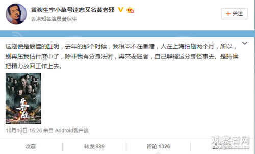 更早之前,网上疯传黄秋生曾发表“蝗虫论”,大骂内地人是蝗虫,甚至叫嚣“我就是要到内地捞金关你X事”。2015年5月28日,黄秋生回应,“警告XX娱乐讯,‘我就是要到内地捞金关你X事’这句不是我说的,传闻是某导演说的,请勿张冠李戴。作为公开的传媒,要有媒介的操守及道德,不能跟三姑六婆一样乱说谣言,请自重?!?/p>