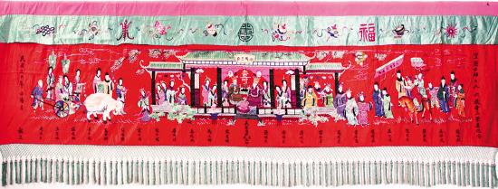 在博物馆墙上,一幅巨大的“郭子仪祝寿”刺绣颇为醒目。这幅刺绣长约两米,篇幅庞大,气势恢弘。绣画中可见郭子仪夫妇端坐正中,七子八婿身着官袍,跪拜堂前,为双老庆寿。