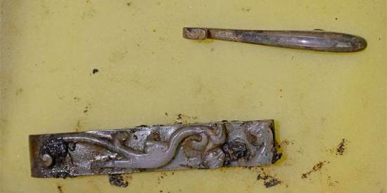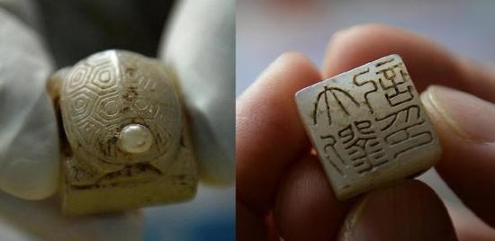 虽然没有正式开棺,但主棺附近出土的文物已经令人兴奋。其中包括三把金丝缠绕的玉具剑、大量玉片、玉饰、虫珀(包裹有虫的琥珀)。而其中,最引人关注的是一枚刻有“大刘记印”的龟钮玉印。印章在古代为凭信之物,是确定墓主信息的关键证物。