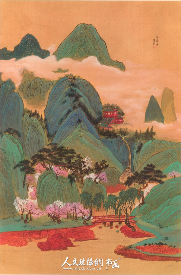 “神韵高古,直逼唐人,谓为杨升可也,非五代以后所能望其项背?!闭馐且曰煜碌恼糯笄壬?981年对潘素《云峰春江》一作所作的题词。大千先生用“神韵高古”和“直逼唐人”精准地概括了潘素青绿山水艺术风格的特色,并将她比为盛唐时期深得张僧繇真传的著名山水画家杨升,可谓备极赞誉。