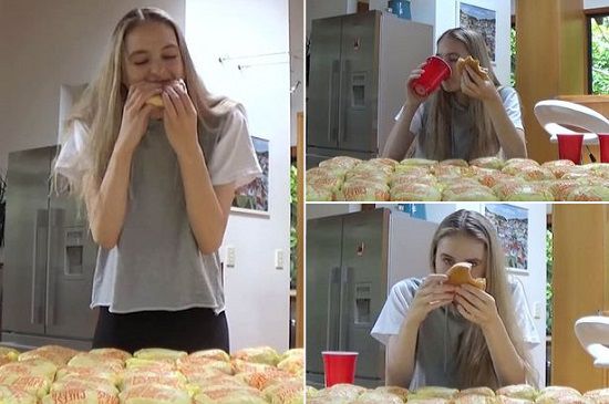 模特妹子挑战一口气吃100个汉堡 完成45个放弃