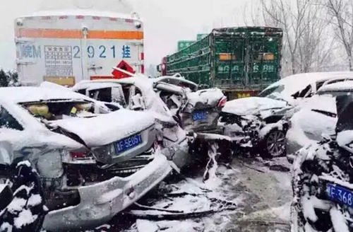 在潍坊的苏先生提供的现场照片来看,高速上多辆汽车撞在一起,车头车尾都不同程度受损,因为巨大的撞击力有的车辆已经调转180度,倒着横在路中间。而苏先生说造成这么多车辆相撞的原因还是雪太大。