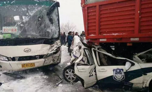 烟台晴天秒变大雪 事故频发警车被挤成铁片