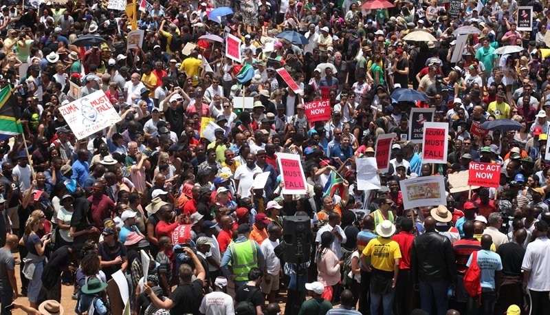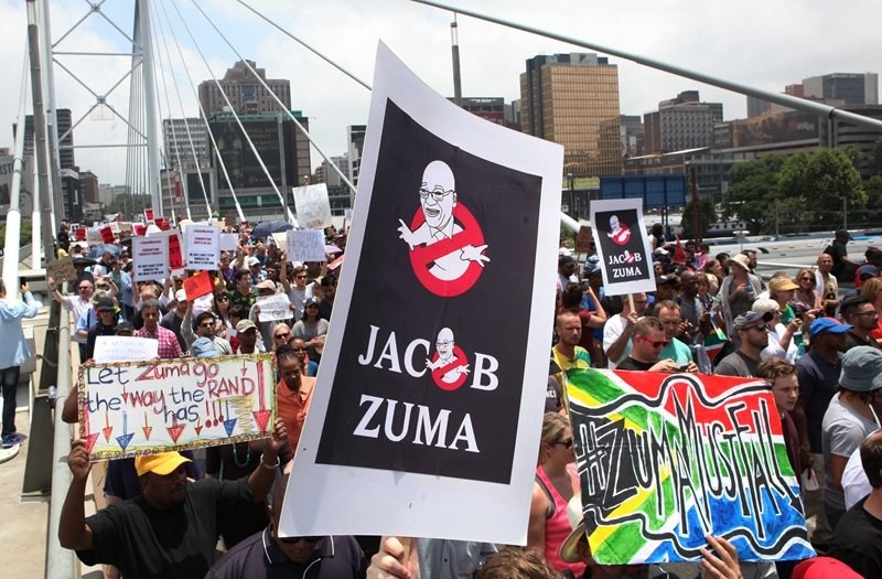 据美联社报道,当地时间2015年12月16日,南非,南非总统祖马连续解雇两名财政部长后,数千民众游行要求祖马辞职。(图片来源:美联社)