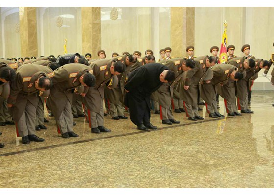 金正日逝世四周年,金正恩赴太阳宫向其立像鞠躬。