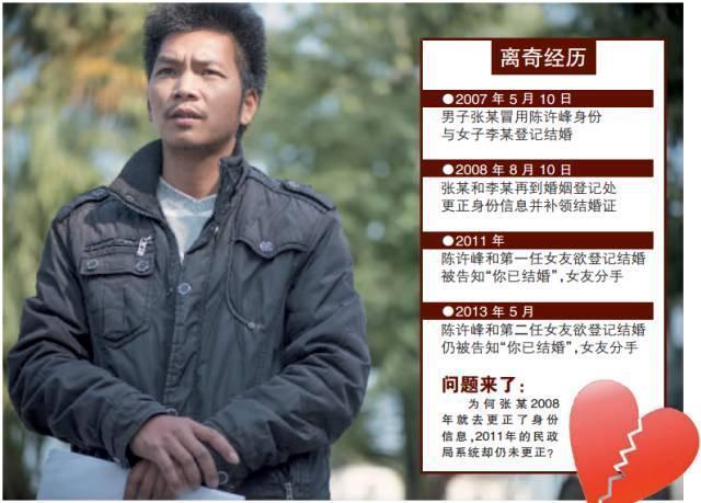 2011年,广州从化鳌头镇村民陈许峰跟女友去镇政府婚姻登记处登记结婚,却被告知“你已结婚”,女友一气之下,与他分手。他调档查询发现,同乡张某冒用他身份证号登记结婚。此时,老实巴交的陈许峰不打算追责,委托村委去协调,对方也承诺会更改,谁知2013年他和第二任女友去登记结婚时,依然被告知“已婚”,女友又与他分手。于是,他将鳌头镇人民政府、张某告上法庭,要求恢复身份并赔偿损失。近日,二审法院判决,鳌头镇人民政府行政违法,但驳回其他诉求。