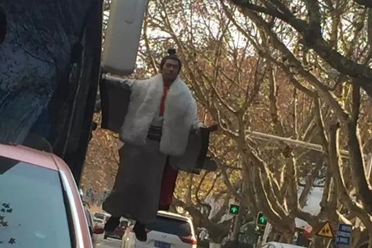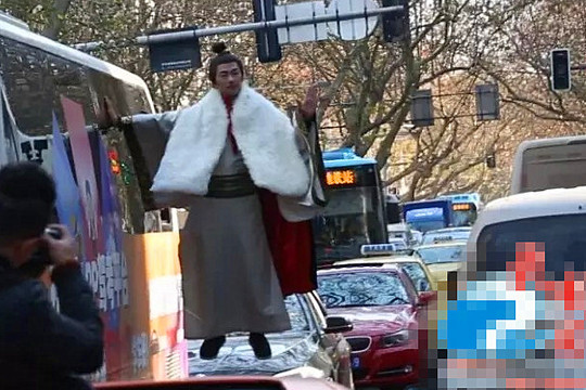 16日,南京新街口中山东路方向一辆行驶的大巴车上,一男子身着古装“悬浮”,单手悬挂在大巴车一侧。