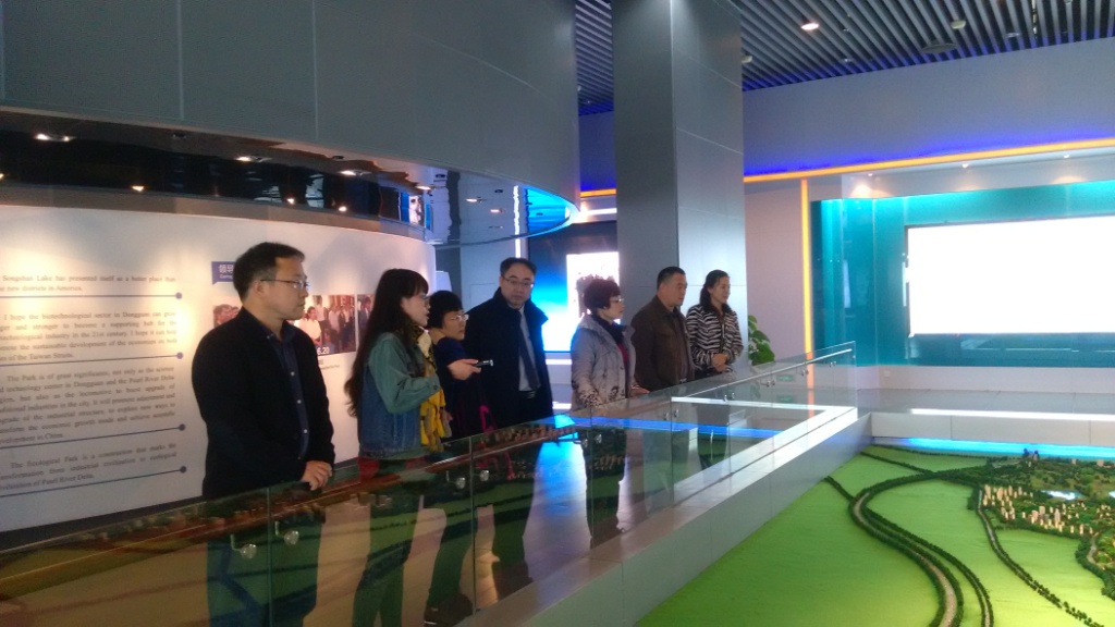 调研组来到东莞市松山湖高新技术产业开发区参观。东莞松山湖高新技术产业开发区于2001年开始筹建, 2010年经国务院批准升格为国家级高新技术产业开发。自开发建设以来,松山湖高新区按照建设东莞“科学发展示范区、转型升级引领区” 和“科技创新高地、人才集聚高地”的目标定位,积极培育发展战略性新兴产业和现代服务业,着力推动科技金融产业融合,不断优化创新政策环境,先后被授予“中国最具发展潜力的高新技术产业开发区”、“跨国公司最佳投资开发区”等荣誉称号,已成为东莞乃至珠三角的一张新名片。在松山湖展览馆,专家们详细听取了讲解员的解说,对松山湖大力实施创新驱动战略取得的成绩予以充分肯定。