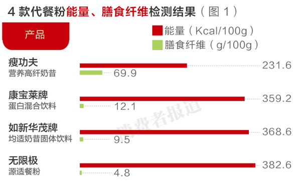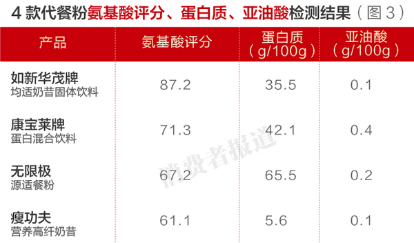 2015年9月,《消费者报道》向第三方权威机构送检了康宝莱牌蛋白混合饮料、如新均适奶昔固体饮料、无限极源适餐粉、瘦功夫营养高纤奶昔四个品牌代餐粉,测定其蛋白质、必需氨基酸及两种必需脂肪酸——亚油酸、α-亚麻酸的含量。