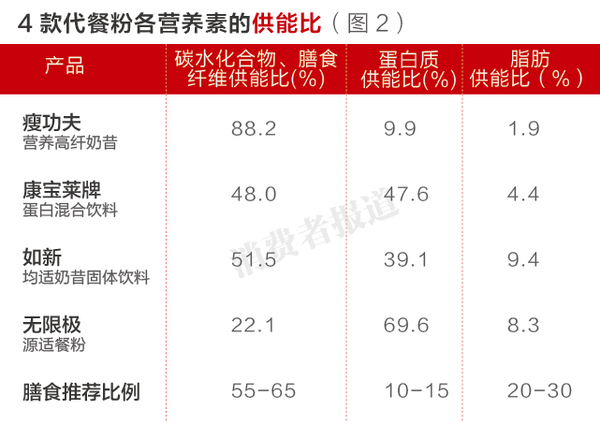 根据本刊检测结果计算,康宝莱、如新、无限极三个品牌代餐粉蛋白质的供能比例大于40%,远高于营养学会推荐值;瘦功夫高纤奶昔主要靠膳食纤维和碳水化合物供能,两者供能比例大于88%,蛋白质和脂肪提供的能量很小。(如图2)