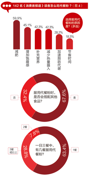 然而部分消费者并没有这样的意识,《消费者报道》代餐粉的调查问卷显示,142名读者中,仍有32.4%的人在服用代餐粉时,不搭配其他食物。(如图4)