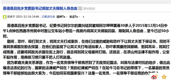 12月16日14时46分,一篇名为“喜德县且托乡党委副书记绑架丈夫限制人身自由”的帖子在“麻辣社区凉山论坛”上发布,引起了网友关注。