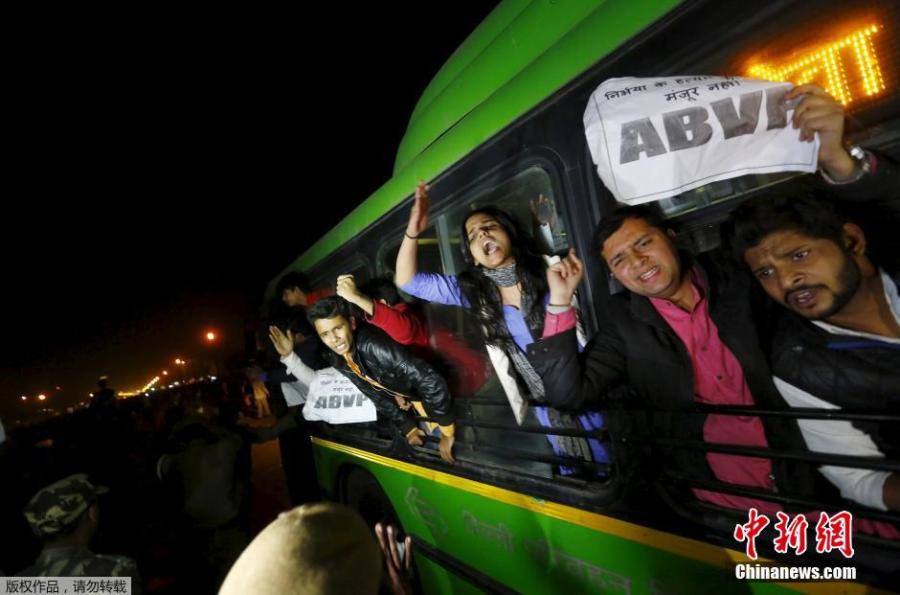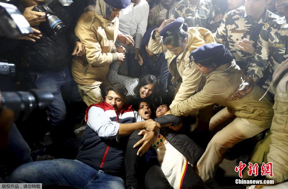 当地时间2015年12月20日,印度新德里,民众爆发抗议。印度新德里2012年“黑公交”轮奸致死案的一名罪犯日前刑满获释,在印度社会引起争议和恐慌,民众示威抗议。
