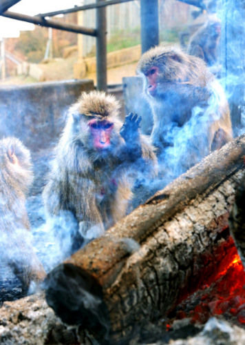当饲养员从炭灰中挖出烤红薯时,本在各自取暖的约150只猴子一拥而上,一边用池水冷却红薯一边咂嘴。