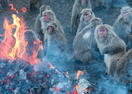 原标题:日本猕猴依偎在篝火前取暖 啃红薯姿态悠哉(图)
