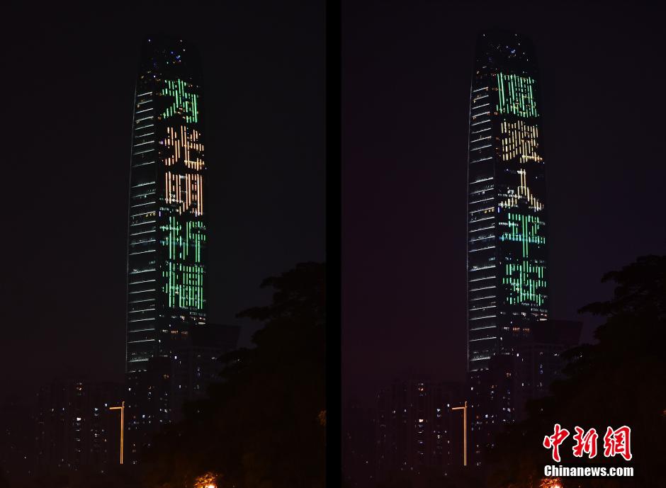 2015年12月21日晚,深圳地标建筑京基100大厦外墙LED打出“为光明祈福,愿家人平安”的巨幅字幕,为深圳光明长圳村山体滑坡受困者祈福。 图片来源:视觉中国