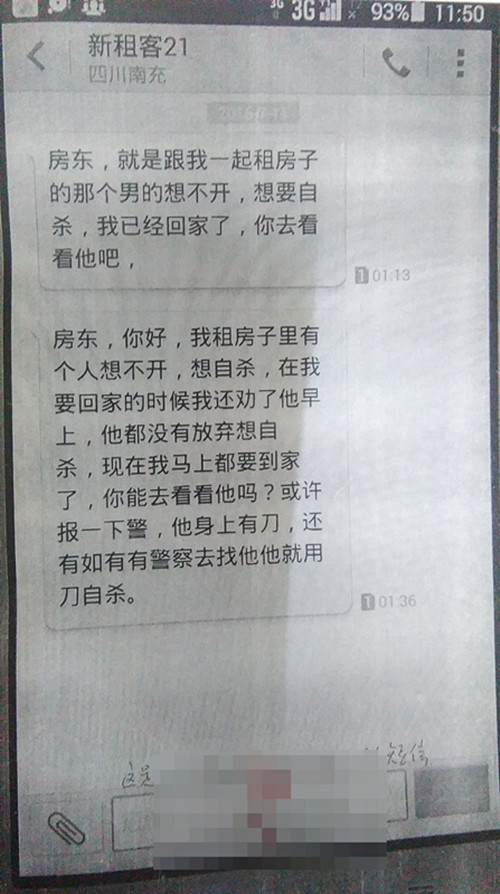 凌晨1点,房东江某接到女租客丽丽(化名)的求助短信,“有人要在你的房子里自杀!”