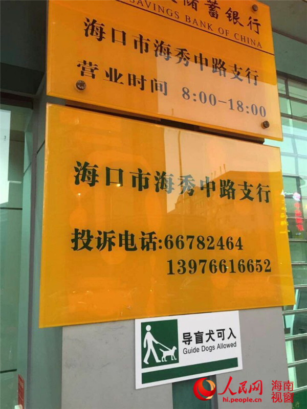 人民网海南视窗海口12月23日电(记者 毛雷)“这样的提示真让人暖心?!比涨埃感牡氖忻窕岱⑾?,中国邮政储蓄银行海口市海秀路支行的门口多了一块“导盲犬可入”的提示牌,该行此举赢得了市民的点赞。据了解,这也是海南省内首家明确规定“导盲犬可入”的银行。